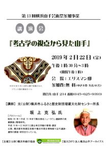横浜市中区山手町では現在、第13回横浜山手芸術祭が開催されています。 その一環として講演会が行われます。 日時:2019年2月22日(金)午後1時30分~3時(開場午後1時) 会場:エリスマン邸 参加費:無料(申込不要 先着60名) 講師:元(公財)横浜市ふるさと歴史財団埋蔵文化財センター所長 坂上克弘氏 主催:(公財)横浜市緑の協会 協力:NPO法人横浜山手アーカイブス PDF版はこちらをクリックしてください