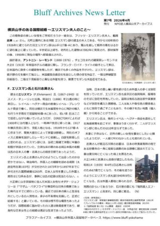 Bluff Archives News Letter 第7号発行 Bluff Archives News Letter 第7号を発行しました。 今回は「横浜山手のある国際結婚 〜エリスマン夫人のこと〜」です。 PDF版はこちらから